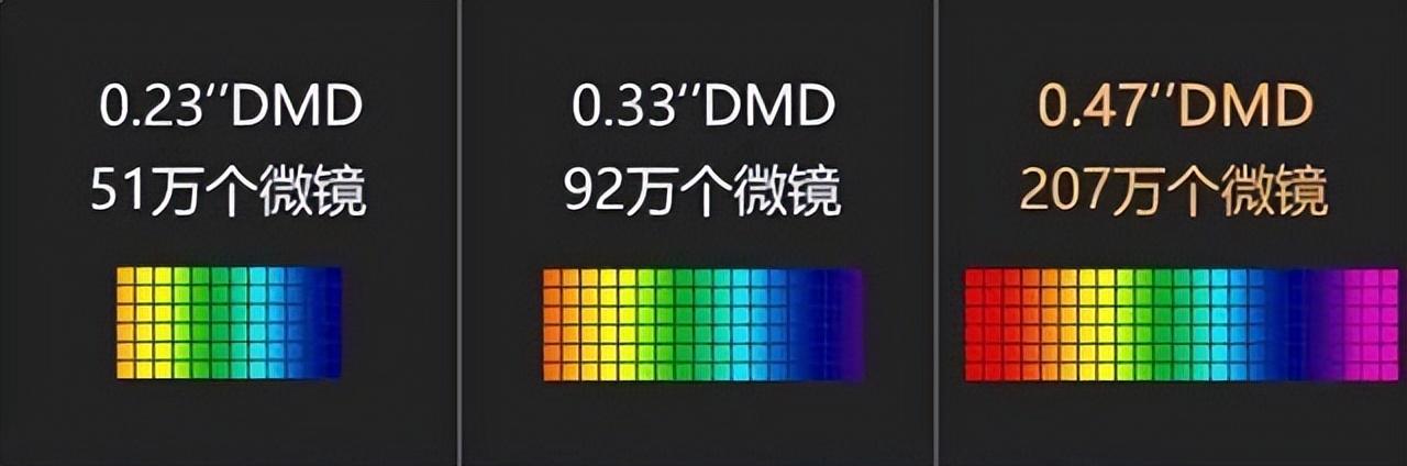 目前市面上常见的显示芯片有0.23DMD/0.33DMD/0.47DMD/0.66DMD显示芯片,但是只有0.47以及0.66DMD显示芯片是可以达到4K分辨率的效果的,0.47DMD虽然原生的分辨率是1080P,但是可以通过XPR抖动技术来达到4K的分辨率;所以尽量选择0.47及以上的显示芯片才靠谱。