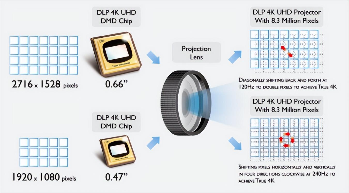 抖4K:利用XPR技术,将芯片移动半个像素,一帧画面分多次投影,利用视觉暂留现象叠加使屏幕呈现4K效果。