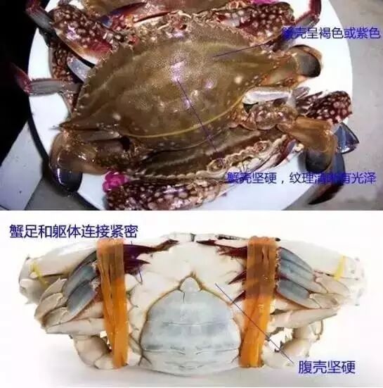 二是看背部,蟹壳呈褐色或紫色,且坚硬,纹理清晰有光泽的为佳;三看其生命活力,可以将其翻过来,能迅速翻身说明非常健康,如果不能翻身说明生命力不强;四看腹壳的软硬,用大拇指去挤压,硬的说明肉质肥厚;五是看蟹足,蟹足和躯体连接紧密,提起蟹体时蟹足坚硬,不松弛下垂的最肥满。六是掂重量,如果两个相同大小的,用手掂量一下,哪个重哪个肉就多了。