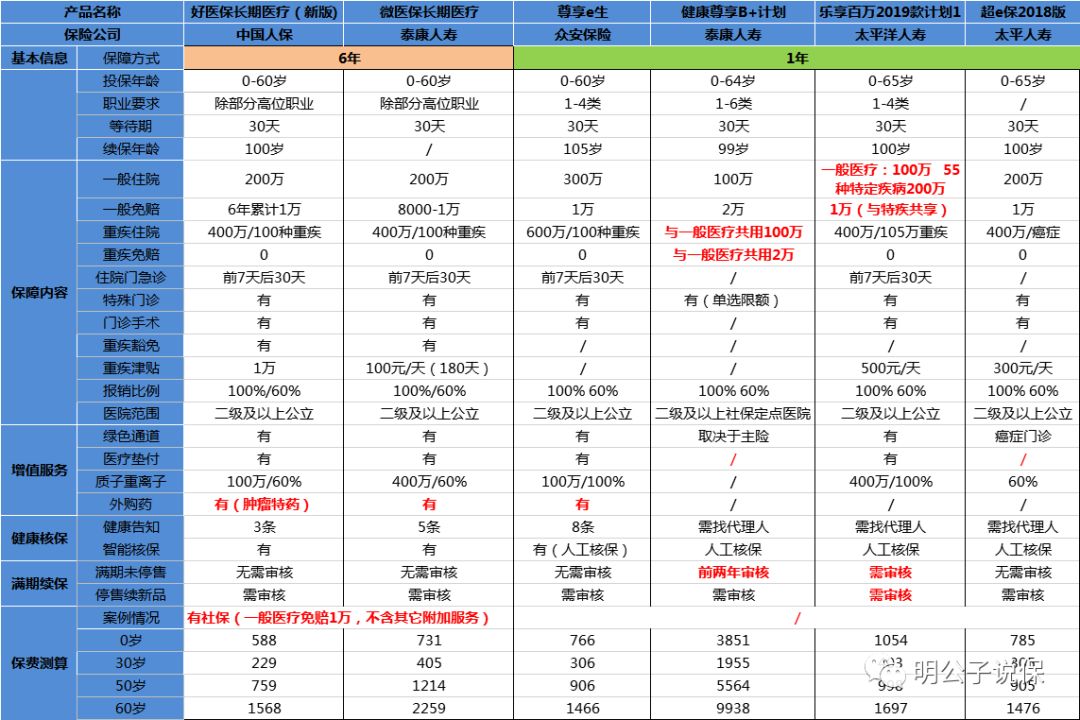 我盘点了目前市面上比较热卖的6种百万医疗险供大家参考:两款6年保证续保和4款1年期。