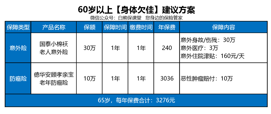 举个例子:给65岁身体不太好的父亲买保险,意外险+防癌险,一年3000多左右。