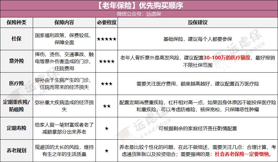 一般来说,老年人建议按照以下优先级来配置保险:社保>意外险>医疗险>定期重疾险或防癌险>定期寿险(关注养老规划)