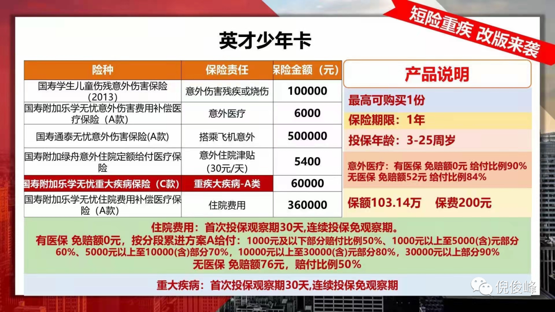 如果你预算非常有限,可以购买一份学生险,用非常低的保费撬动几十上百万的保额,可以解决小孩子绝大多数的医疗自费的问题。