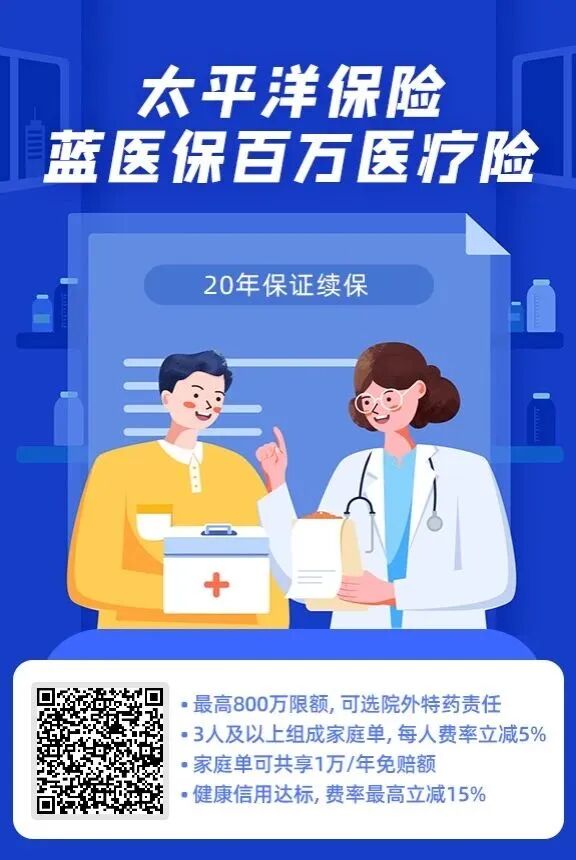 推荐:太平洋蓝医保,保障范围内自费超1万元部分100%报销,大病最高能报销400万,并且可以保证20年续保。
