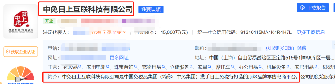 中免日上的账号主体为中免日上互联科技有限公司,通过企业查询也可以看到,中免日上互联科技有限公司是中国免税品集团(简称:中免集团)携手日上免税行打造的顶级品牌零售电商平台。