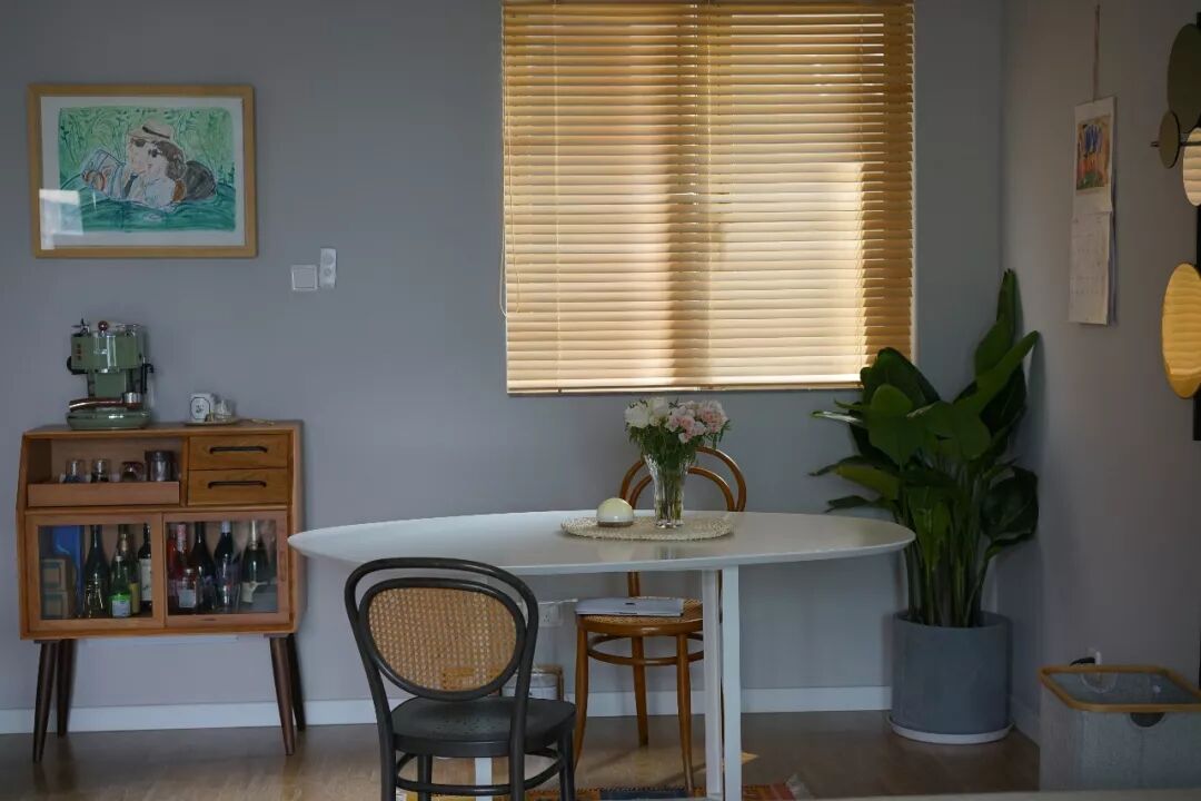 这个边柜非常上镜,一开始放音箱和花,现在把咖啡机搬过去,彻底变成一个小水吧了。