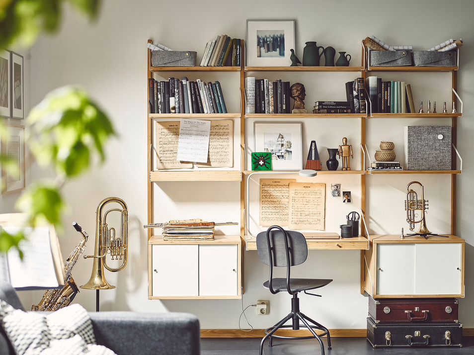 宜家这款之所以是性价比之王,因为用十分之一的价格,就拥有了一套wall unit,还可以根据自己书房墙壁的尺寸来调整,挂杆、隔板(有两种宽度和长度组合)、柜子、抽屉都可以自行组合。