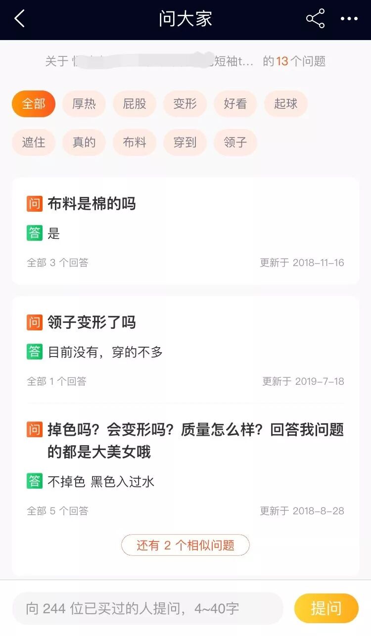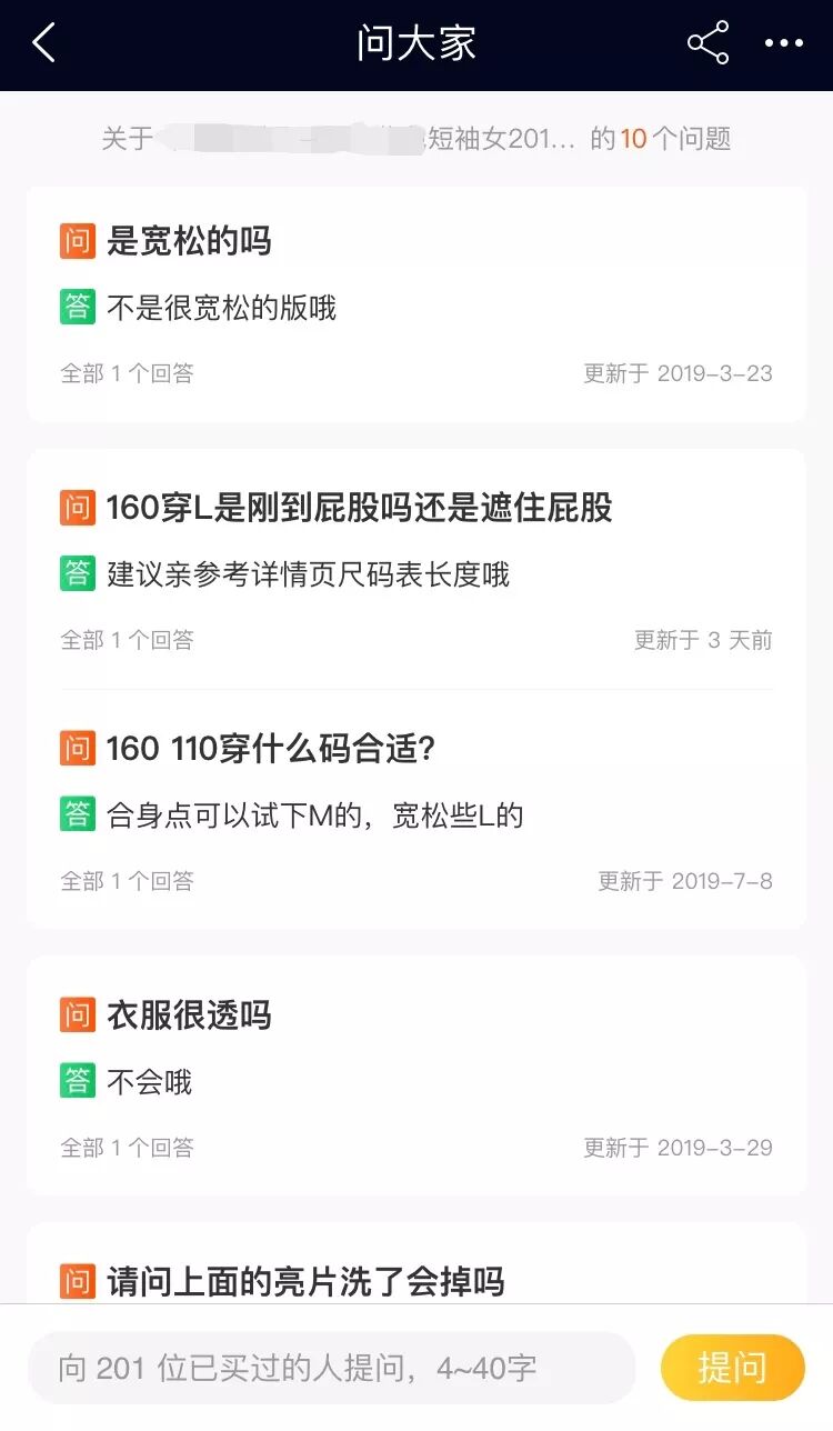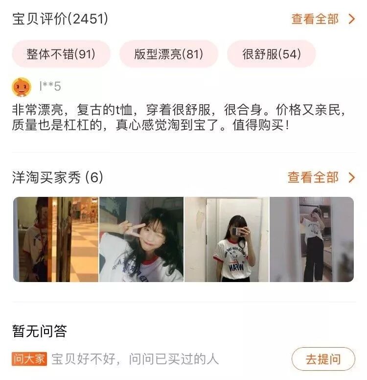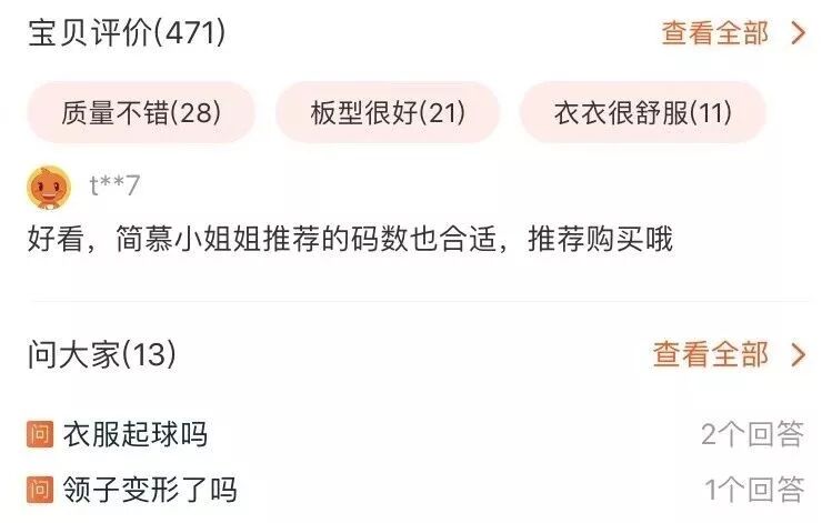 假如你看的这个商品评价数量很多,可是问大家里一个问题都没有。这也是衣服存在质量问题的预警。