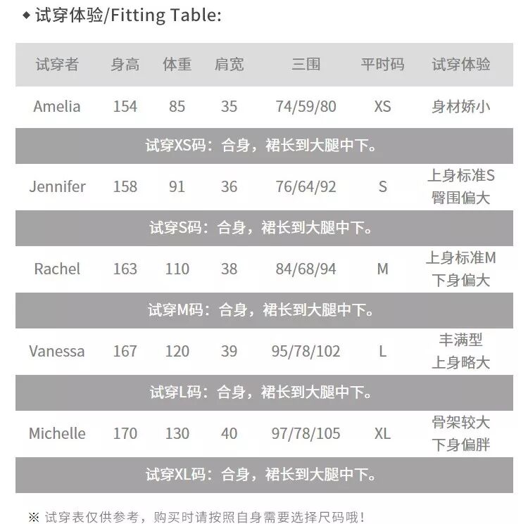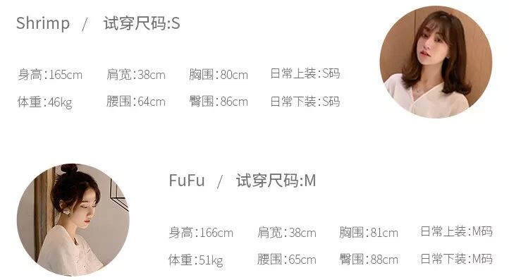 有些只有单独一个的模特尺码,有些是找来多个模特尺码作参考。前者这种情况下,你们就要再看衣服的尺码进行比对。后者则更方便你们选更接近自己的尺寸。