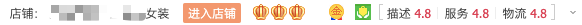 在进入店铺旁边可以看到店铺好评率以及描述、服务、物流,这三项总称为店铺的动态评分。