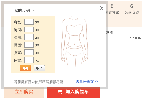 淘宝也有自带的尺码推荐功能,电脑端在尺码选择旁能看到一个小小的【尺码助手】,手机端显示的是【查看尺码】。你们可以将自己近期的维度记录到这里,虽然这个功能多数商家都不提供推荐尺码,但是你们自己用来对照尺码表也会方便不少。