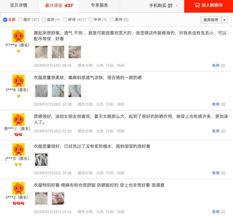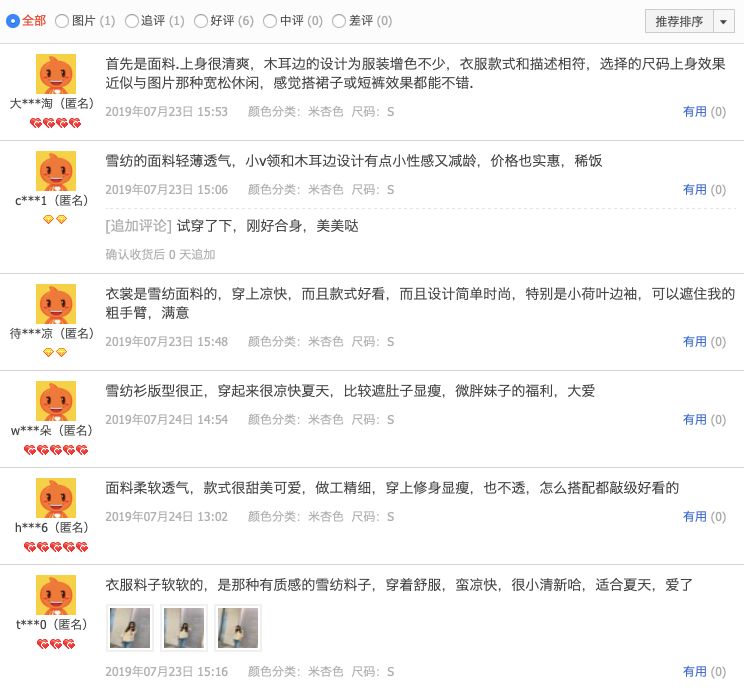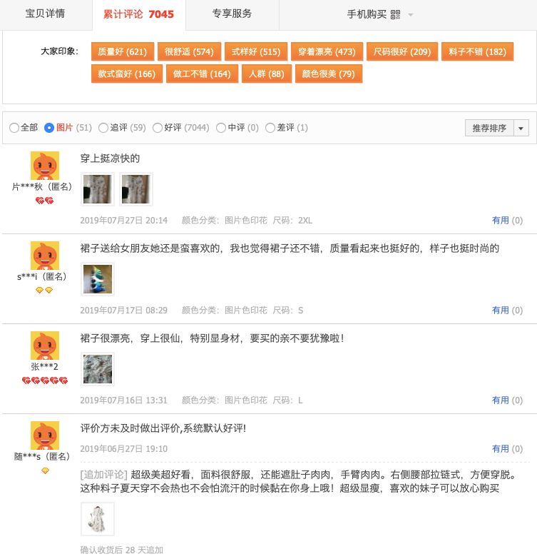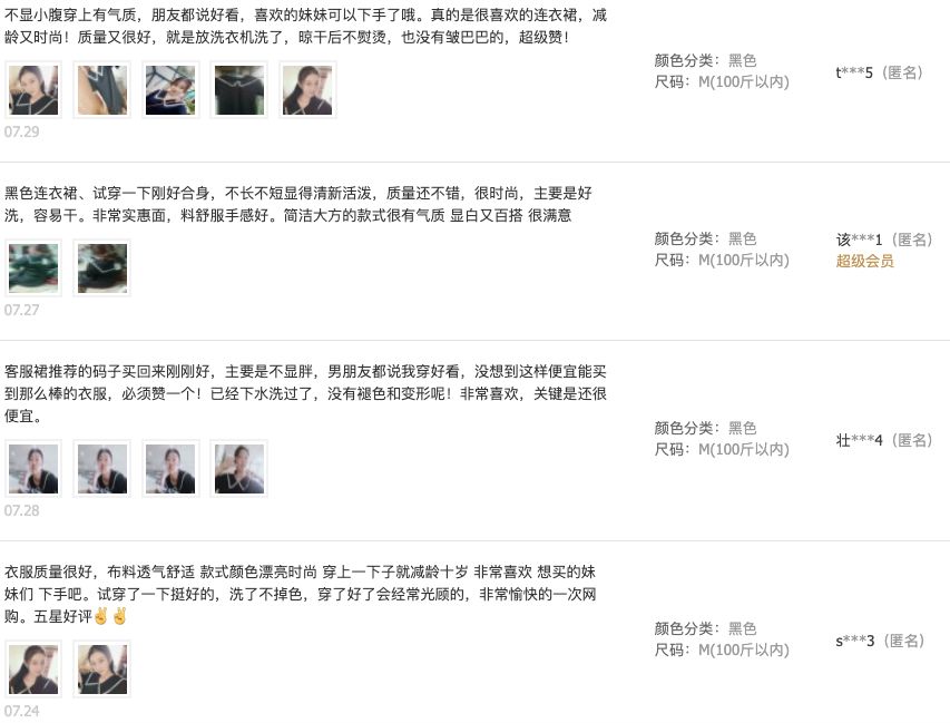 且评论字数均超过 20 字,90% 以上的评论附带图片或都是几颗心的匿名买家且评论内容空洞,那么这款衣服大概率是刷单来的,这家店的可信度很低。