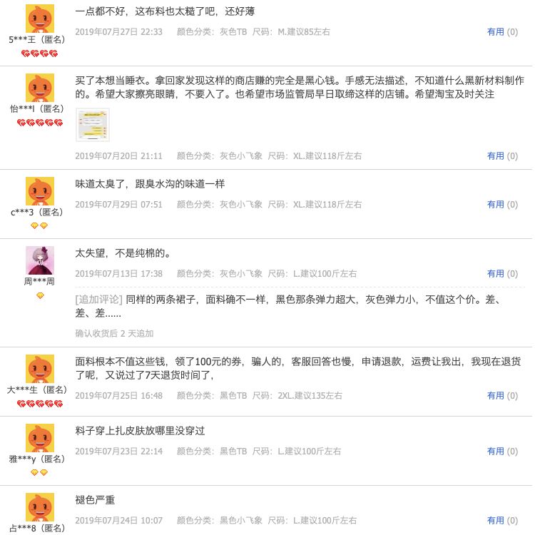像下面这种差评的内容涵盖了面料质量差、虚假描述等问题,这家店就足以 pass 了。