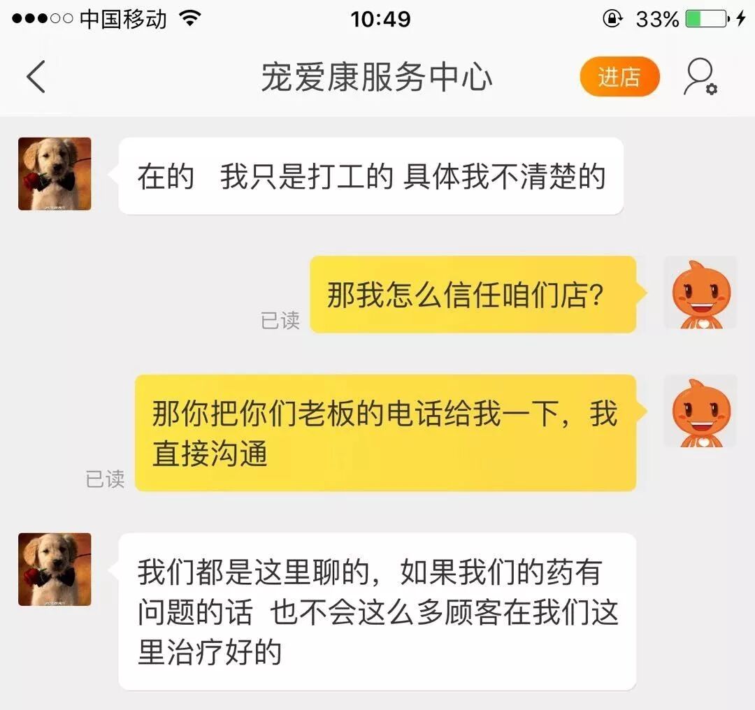 宠爱康服务中心到底有没有问题?记者联系到了工作人员,他以文字形式告诉记者,如果我们的药有问题,也不会这么多顾客在我们这里治疗好的,并且表示店铺手续齐全。