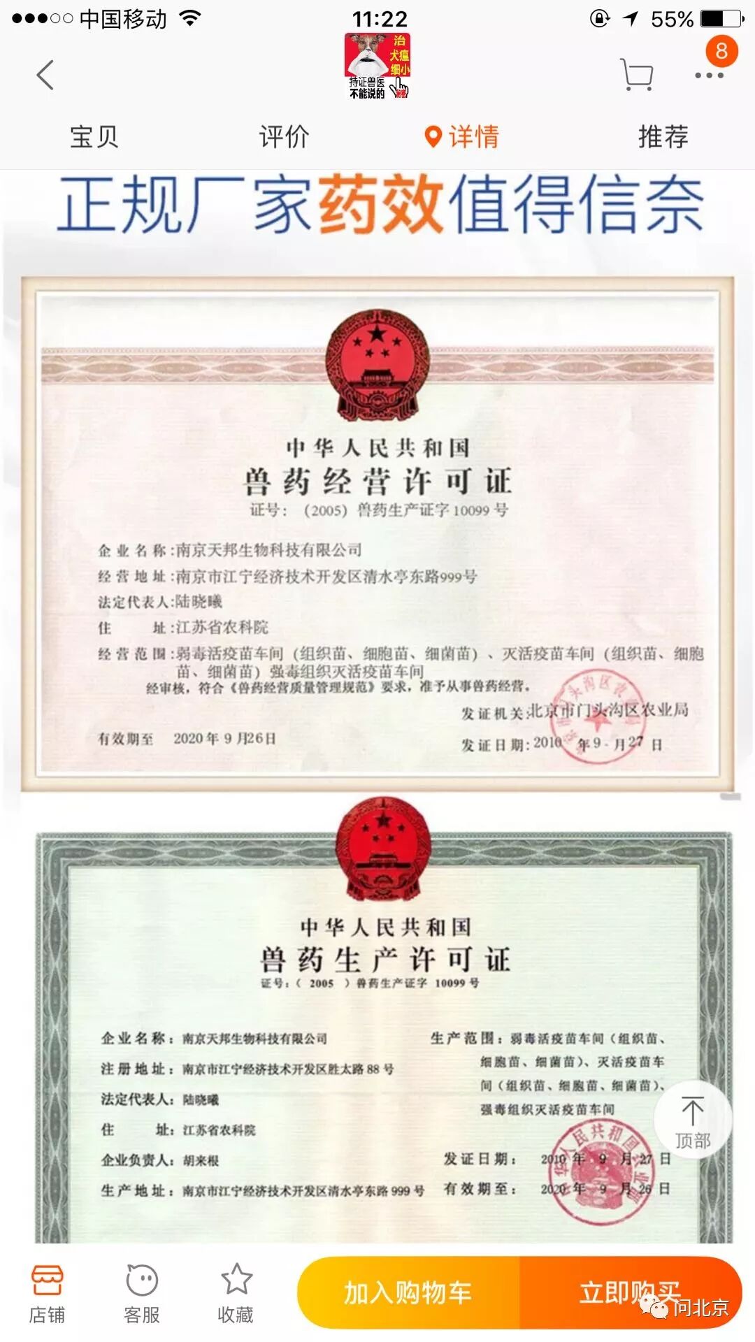 淘宝客服:需要的首先是营业执照,还有兽药的生产许可证,或者是兽药的经营许可证。而且证件的经营范围肯定是包含那个兽药的。他上传的时候淘宝这边人工审核的啊,他假的话他不可能人工审核通过的。