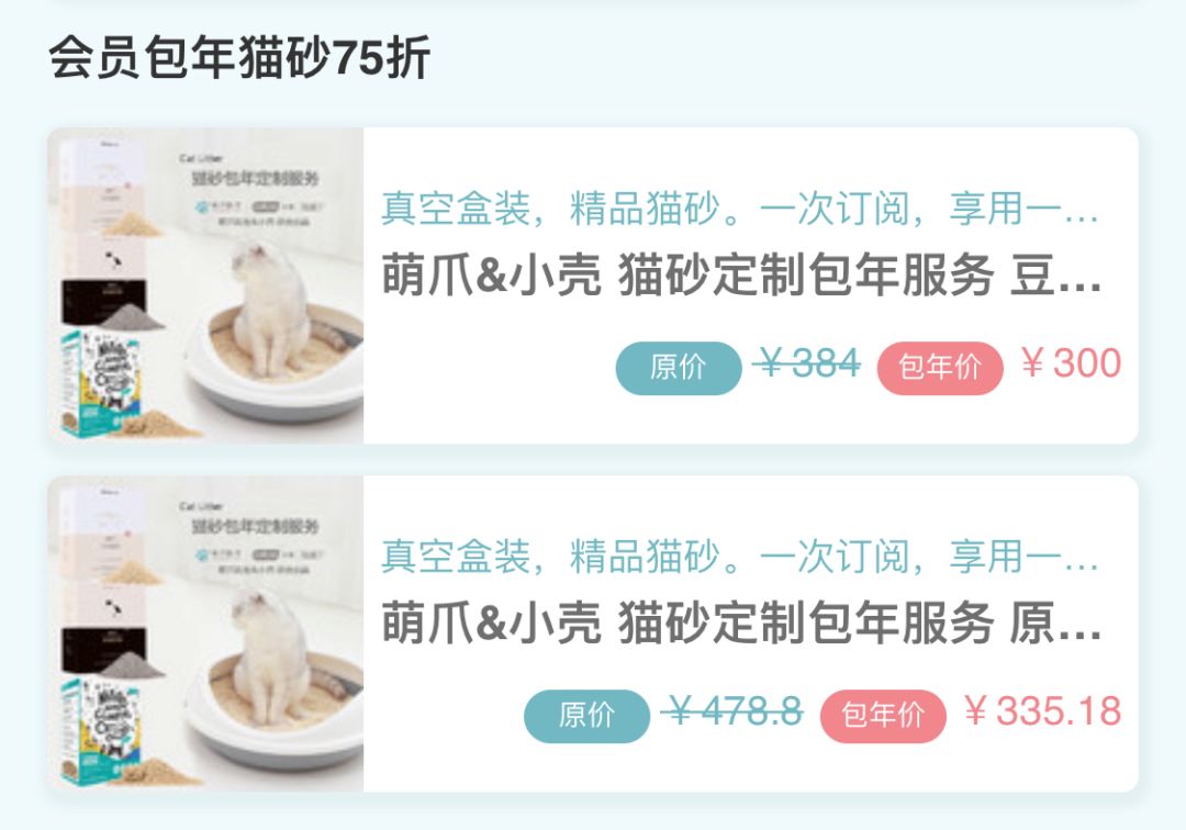 这一部分也是只有会员才能享受到的定制服务。萌爪&小壳一起推出猫砂包年的专属定制,只需订购一次,可以满足全年的猫砂供应。