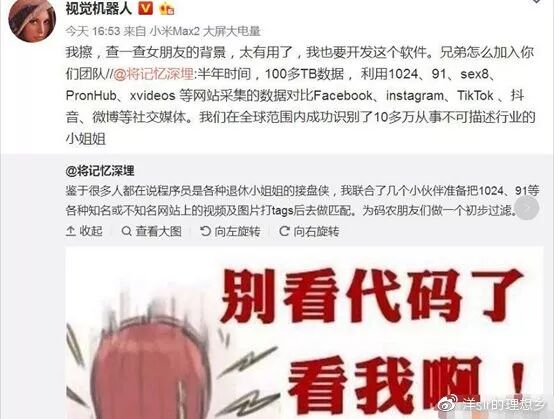 说到这想起前段时间微博上引发讨论的原谅宝APP,说是帮程序员等老实人鉴婊,通过人脸识别就可以查出女孩有没有拍过不雅照或者视频。