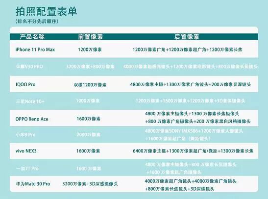 这里我们盘点了2019年在影像方面最具代表性的9款智能手机,分别为荣耀v30 PRO,OPPO Reno Ace,vivo NEX3,iQOO Pro 855版,iPhone 11 Pro Max,三星Note 10+,华为Mate 30 Pro,一加7T Pro,小米9 Pro(注释:排名不分先后),其摄像头配置如上图所示。