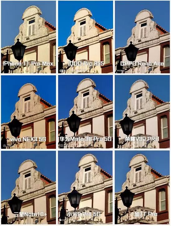 正常光线拍摄下9款手机进行对比,在日光照片上简直分不出个大差距,照片的锐度、解析力都控制得十分不错,唯一的差距就是各厂商间的颜色调教。其中,iPhone 11 Pro Max的颜色是9款机型中最还原的,比其他拥有AI场景识别的手机,拍出的照片更真实。