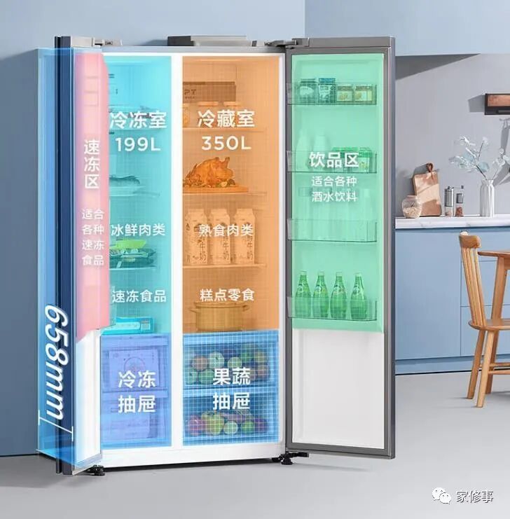 白色对开门超薄设计,可以方便取放食物,外观简洁,颜值非常高,可以嵌入式设计到客厅、厨房等空间,高档大气。配有总容量为549L超大容量,其中冷藏室为350L,冷冻室为199L。