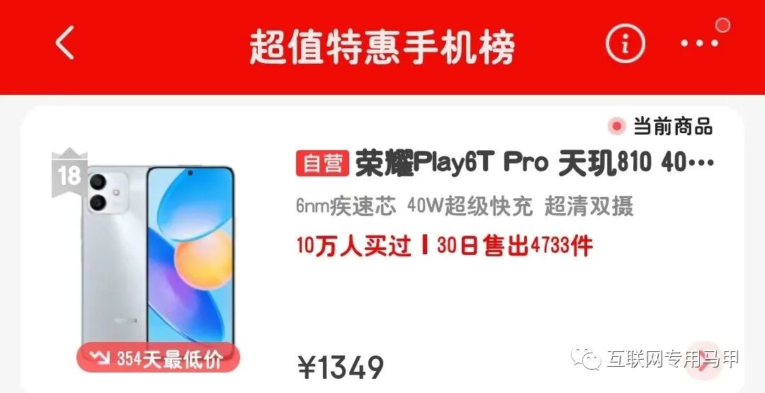 荣耀Play6T Pro相对前两款机子,可能相对偏冷门一些,但也有4733件的月销量,入选京东超值特惠手机热卖榜,8+256大内存版本只要1349块,谁见了不心动呢?超适合预算不足的小伙伴入手;