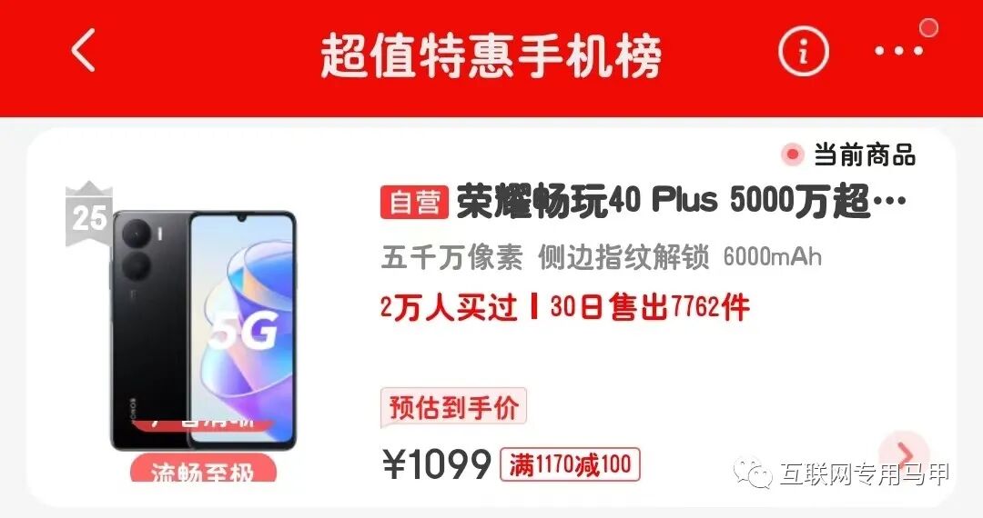 荣耀畅玩40 Plus是去年10月份发布的一款标准千元机,最低6+128版本只要1099元就能拿下,相比发布价优惠了100块,入选京东超值特惠手机热卖榜,排第25,30天可售出7762件,这销量有点惊人啊;