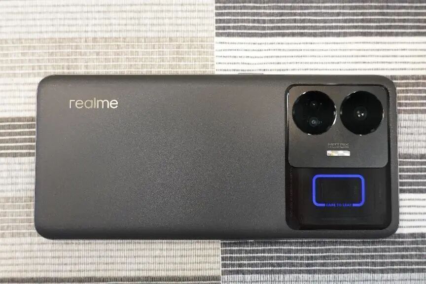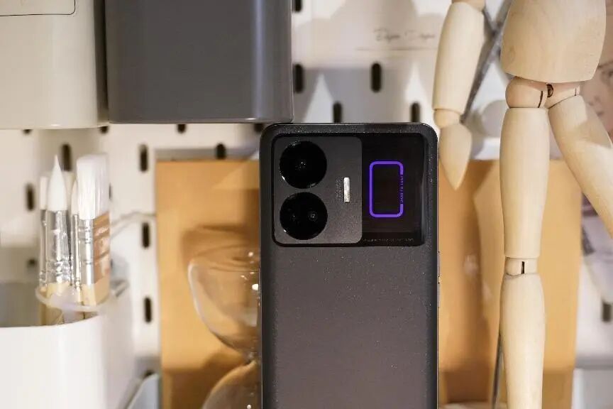 另外,值得一提的是,背面还有一大块摄像头模组,不全是摄像头所占。模组左半边部分是经典的三摄,主摄占一个圈,两个副摄共一个圈,闪光灯点缀在旁边。而右半边部分是透明的,能清晰看见内部的骁龙8+ Gen1芯片,另外右半部分也搭载了早已江湖失传的呼吸灯,当手机接收到通知时,呼吸灯就会变亮闪烁。呼吸灯也不单调,真我GT Neo5专门为其设计了一套功能,多达25种颜色可随心变换,也提供了5档速率变化调节。