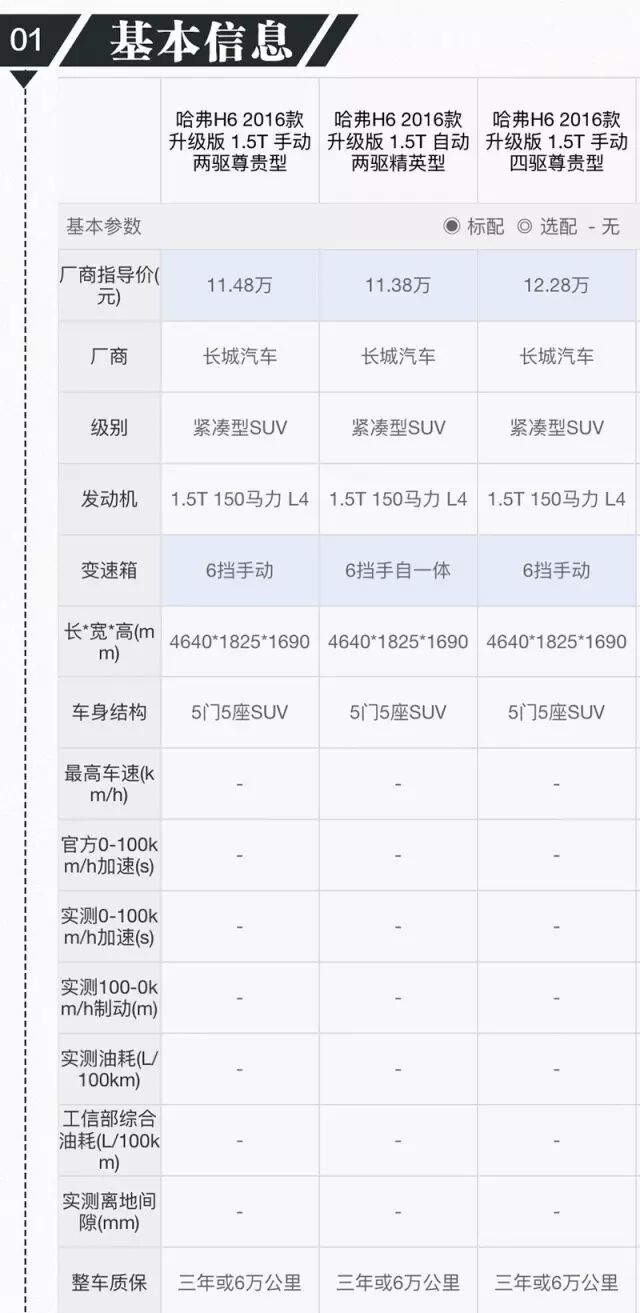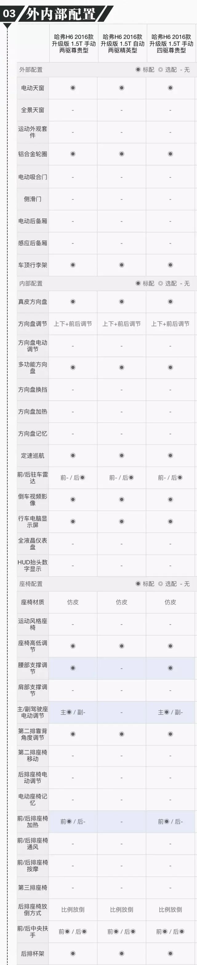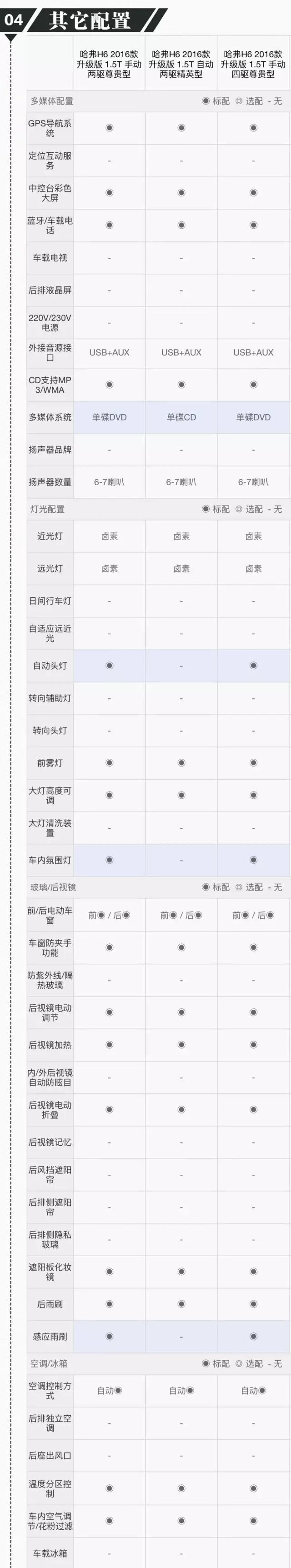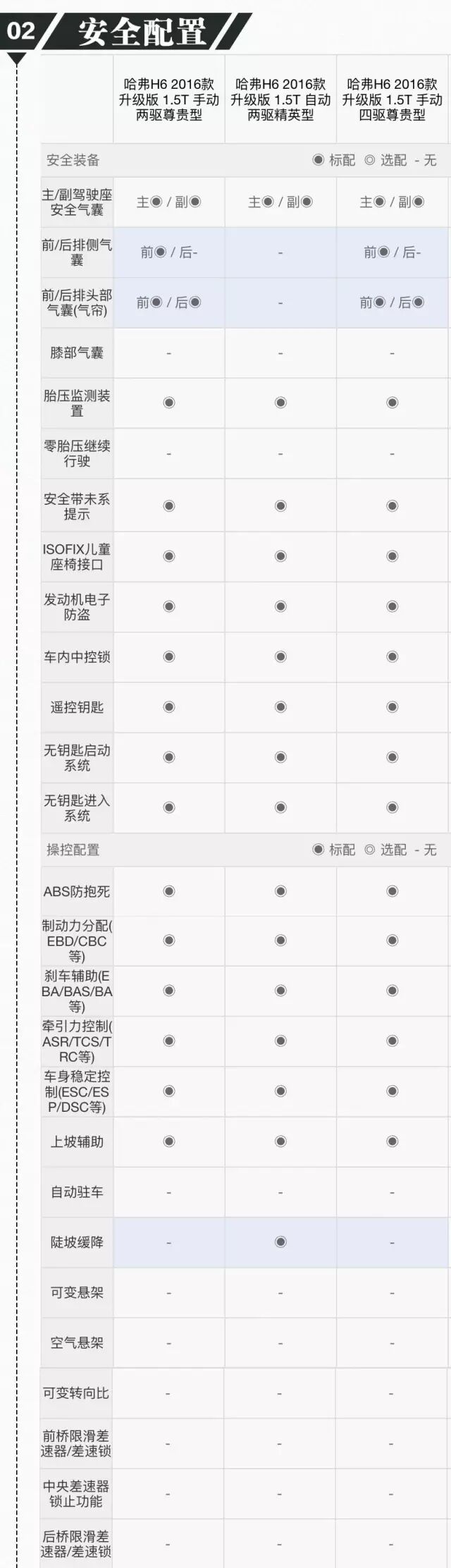可以看出H6的安全配置非常丰富,2016款车型都已经全部装备了车身稳定控制系统,这个值得表扬,也反映出H6的确是很了解消费者的需求。回顾对比的三款车型,价格最便宜的1.5T自动两驱精英型安全配置的差别主要在于前/后排侧气囊及气帘,不过它也提供了陡坡缓降功能,算是各有长短。