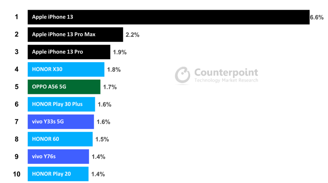 其中,苹果iPhone 13占据了5%的整体市场份额,占iPhone销量的28%,并据此在全球畅销机型榜单中高居榜首。其销量是第二名的两倍多。