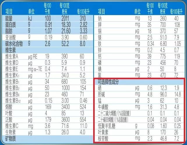 后面标示的可选添加成分,表示这些营养物质不是国家强制要求添加的,换句话说,生产厂家可添加,也可以不添加。所以,奶粉的营养丰富程度,重点就是看这部分(红色框内的部分,也是影响奶粉价格的因素之一)。