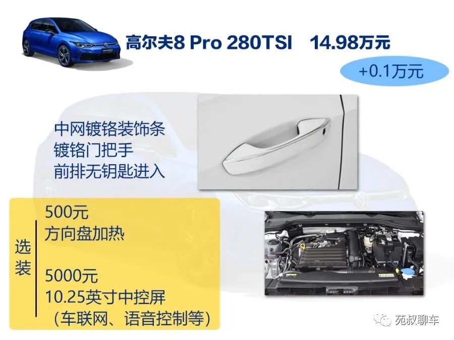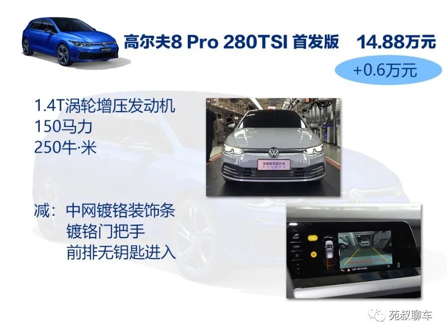 Pro 280TSI售价14.98万元,这也是目前在售高尔夫8的次顶配车型,相比首发版价格提升了1000元,而这部分的差价换来的配置就是前排无钥匙进入。换个角度看,Pro 280TSI和Pro 200TSI相比配置一样,花费7000元就是为了升级动力。售价接近15万,用1000元换来前排无钥匙进入还是值得的,所以这么对比的话,首发版明显就没有Pro 280TSI性价比高了。