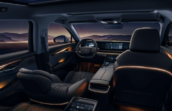 值得一提的是,这款车的座舱被打造成了真正的第三生活空间,除了乘坐宽敞舒适之外,大家还可以在其中享受到视觉、听觉、触觉、嗅觉的全新豪华体验。这款车的内部配有128色无极调节全域呼吸式氛围灯,这是同级独有的配置。