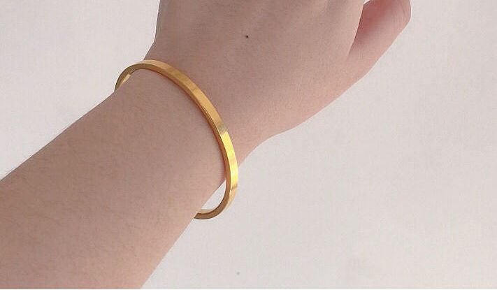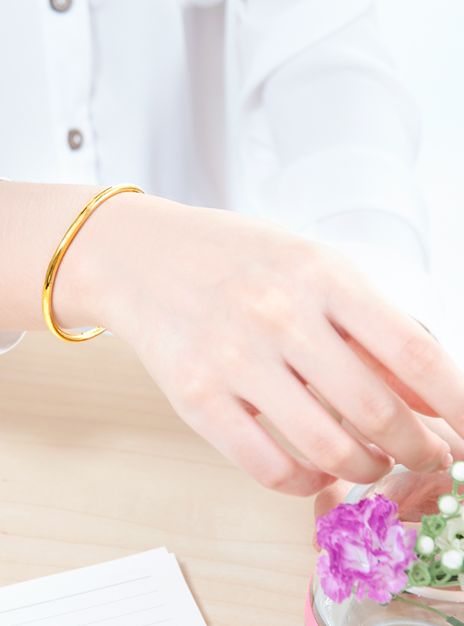 开口镯是最受欢迎的黄金手镯之一,其镯身有一段开口,浑然一体之间也显得精巧细致。