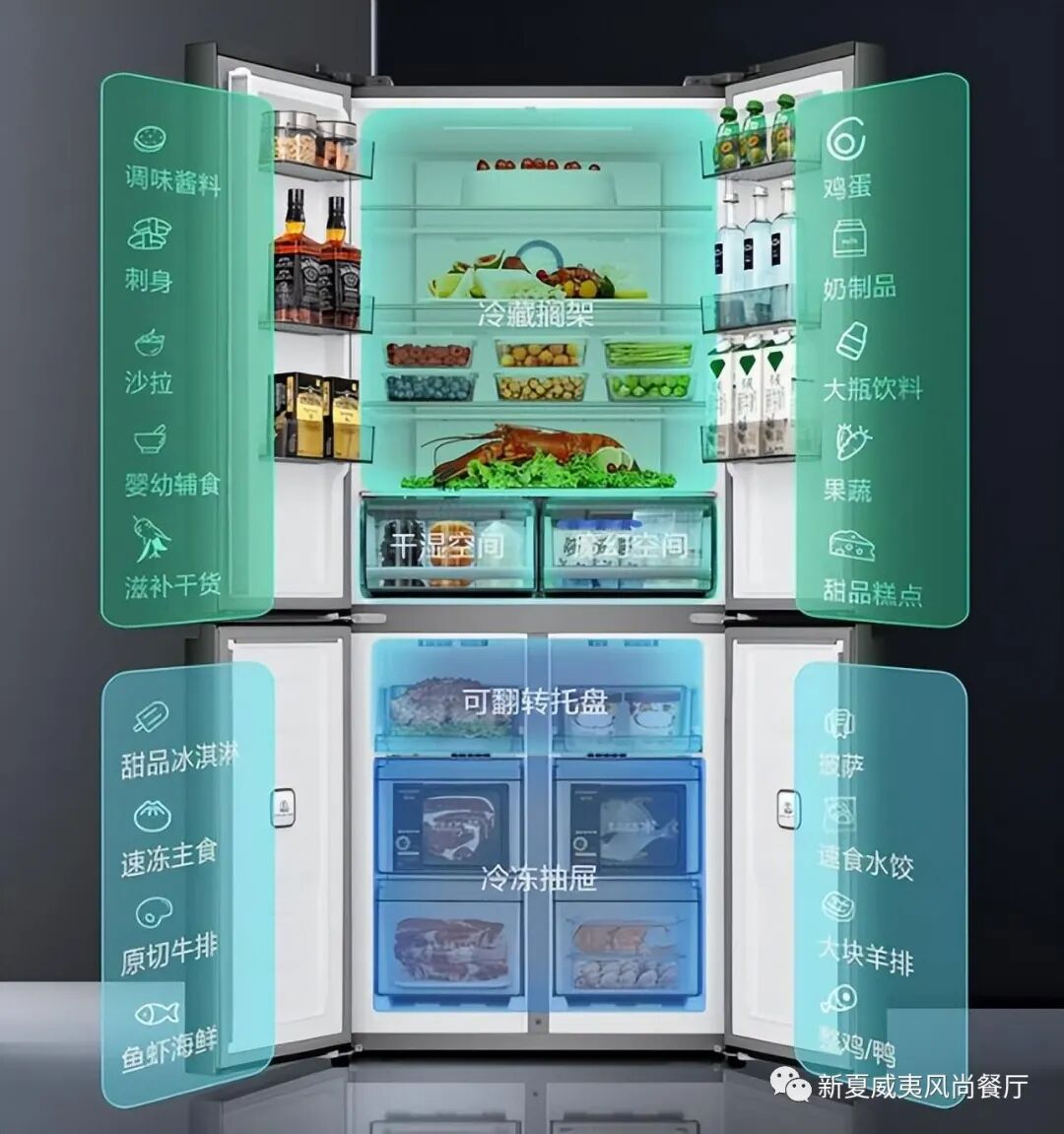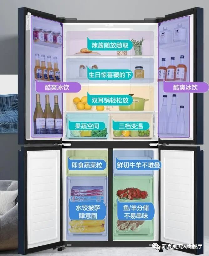冰箱的布局和类型也是很重要的。家用来说,一般以双门电冰箱、三门电冰箱和四门电冰箱。还有对开门和十字门的选择,各有各的优点。像十字门冰箱还有变温区或者干湿分储区,给我们提供了更多的冷藏选择,但是价格也更贵一点,根据自己的需求选择就好。