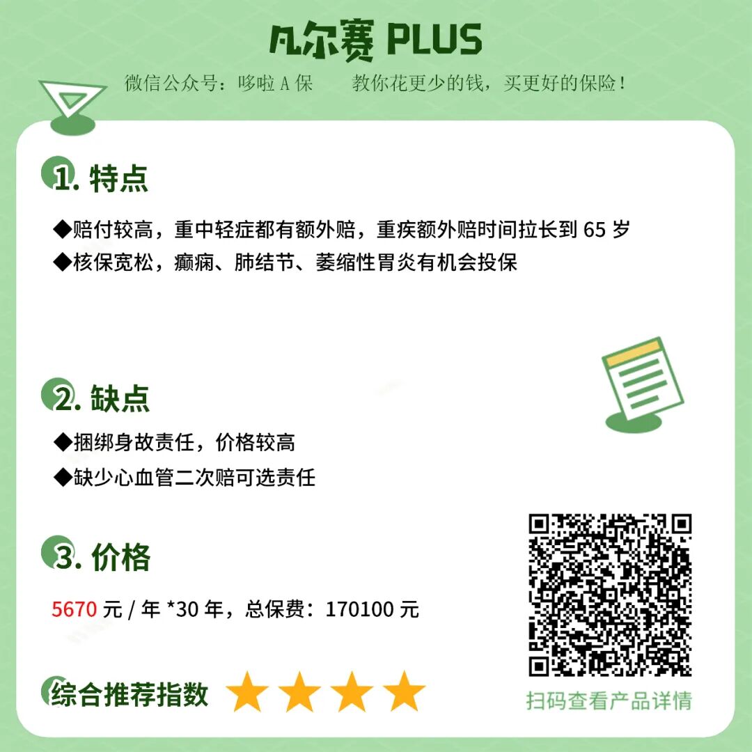 ②适合人群:看重保障全面,重疾/身故赔付高,平时压力比较大的朋友。