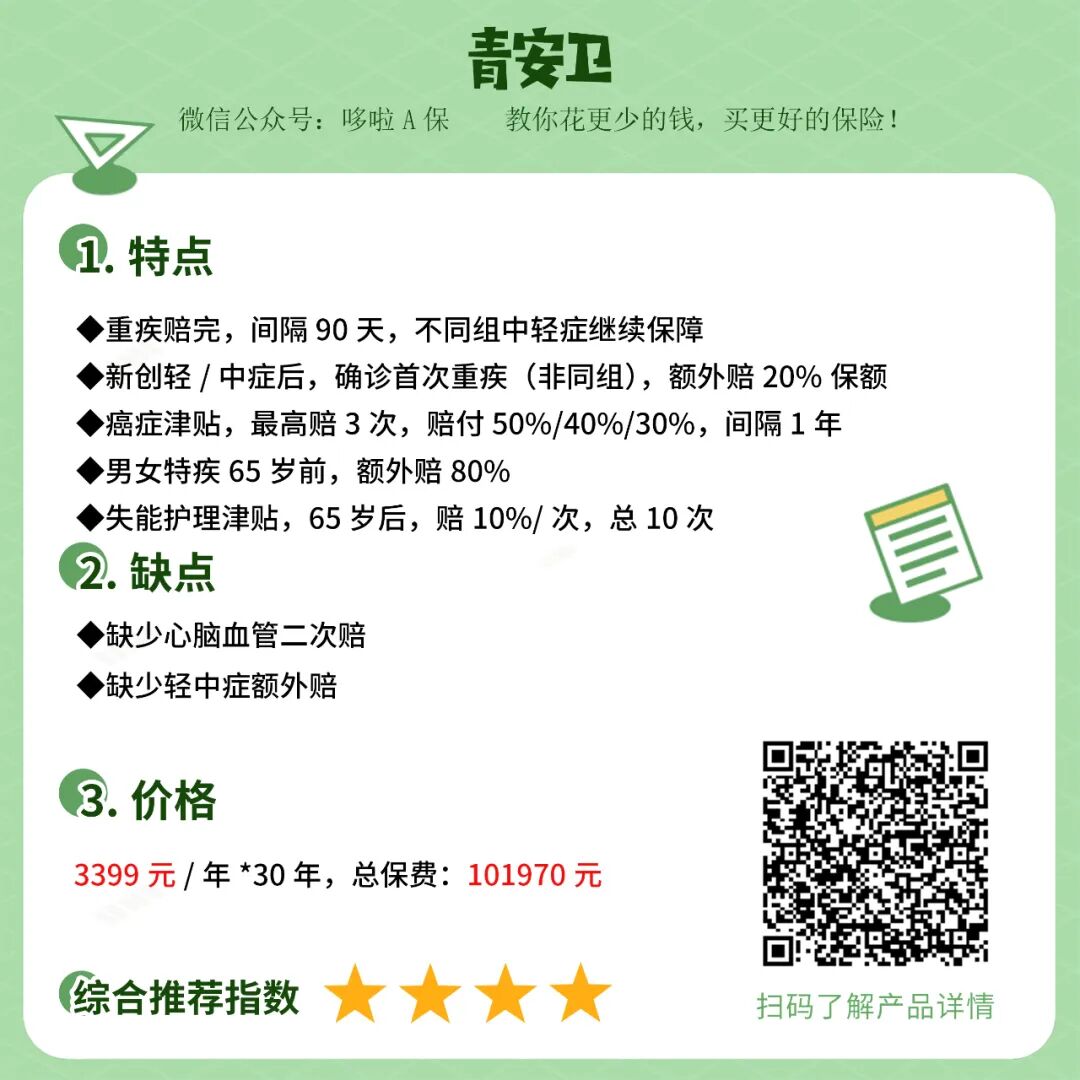 ①综合性价比:青安卫可选男女特疾关爱金/失能护理津贴/癌症津贴,保障很足,高发疾病赔得多;增值权益丰富,由轻到重,涵盖门诊、住院以及手术绿通,针对重疾诊断配套先进的MDT多学科会诊,还提供专业护工服务等。