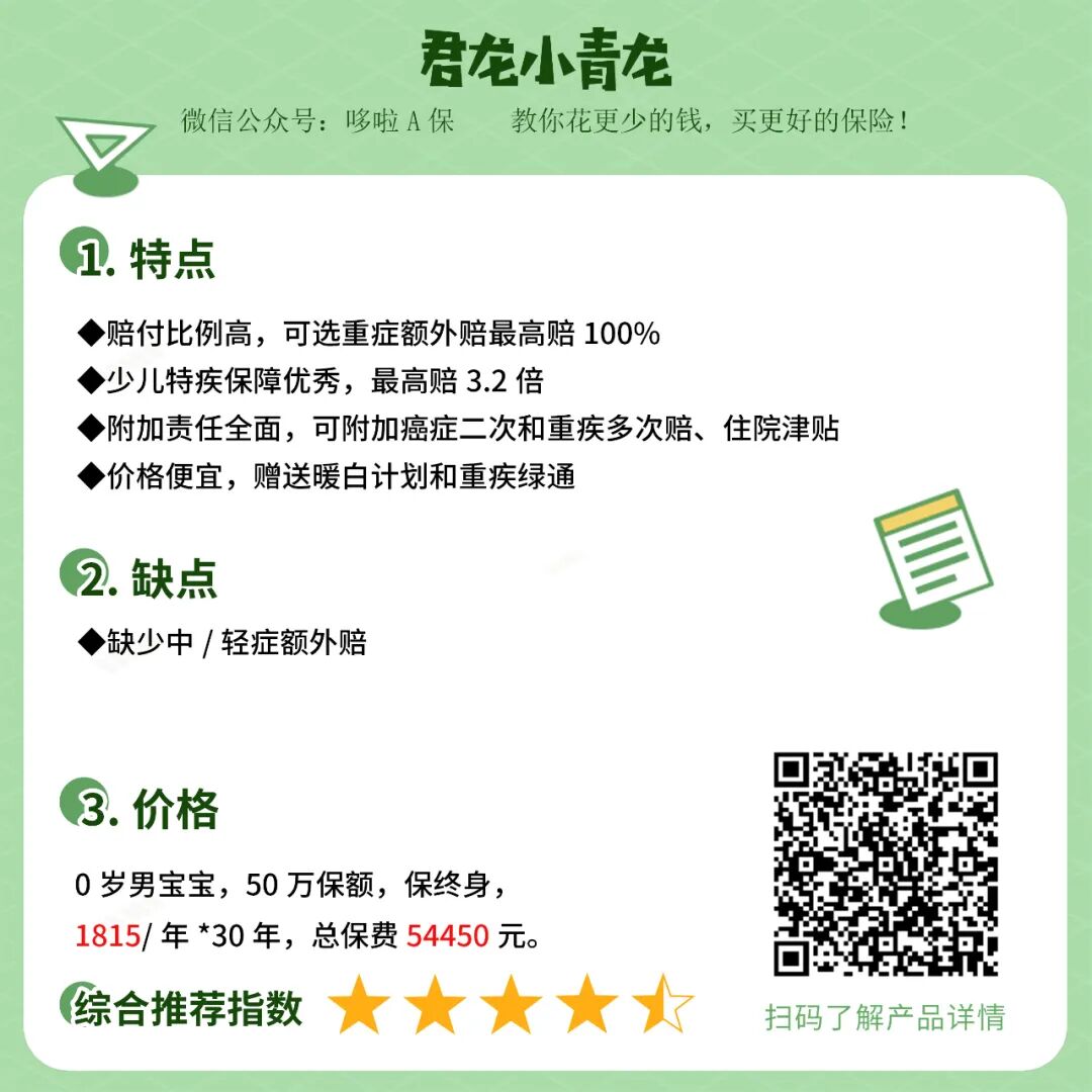 ①综合性价比:保障全面,重中轻额外赔付比例高,少儿特疾赔得多,20种罕见病赔得广,增值服务丰富,保费不贵,性价比非常不错。可惜下架了保至70周岁版本。