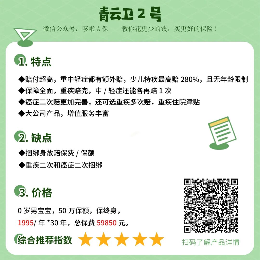 ①综合性价比:大公司产品,保障超级全面,额外赔得多,保得久。少儿特疾最高能赔280%保额,综合性价比很高