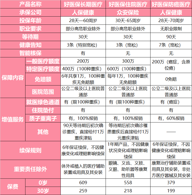 目前好医保系列一共有三款产品,好医保长期医疗、好医保住院医疗、好医保防癌医疗,责任上都是不错的产品。