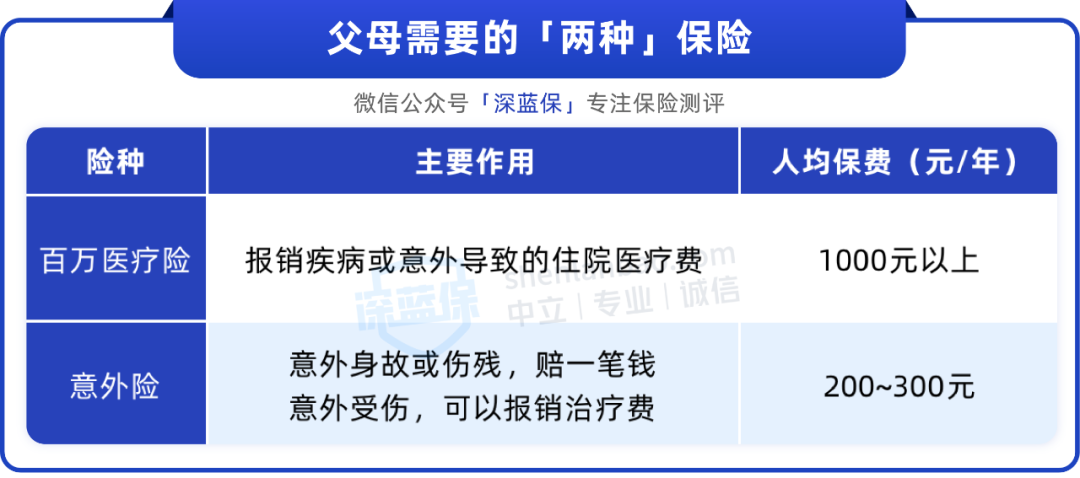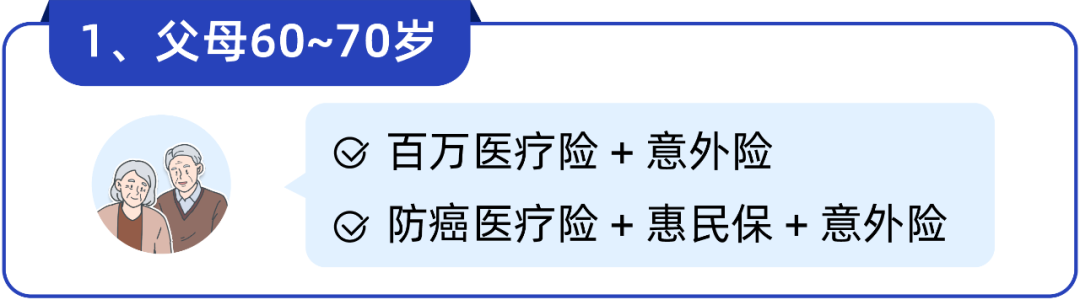 一般情况下,我们建议大家优先给父母配齐百万医疗险和意外险,重点做好疾病和意外保障。尤其是超过 50 岁的父母,他们身体各项机能下降,更需要提前做好保障。