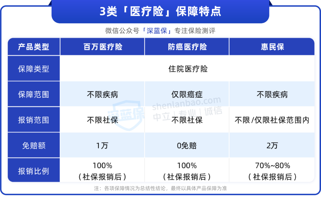 对于百万医疗险、防癌医疗险和惠民保,有些朋友可能不清楚它们有什么区别。我们做了一张对比图,给大家参考:
