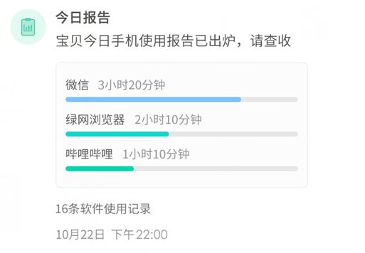 每天晚上10点会准时发送孩子当天手机使用情况的卡片给家长。对于孩子软件使用时长、使用情况一目了然,方便家长有针对性地对孩子进行教育和管理。