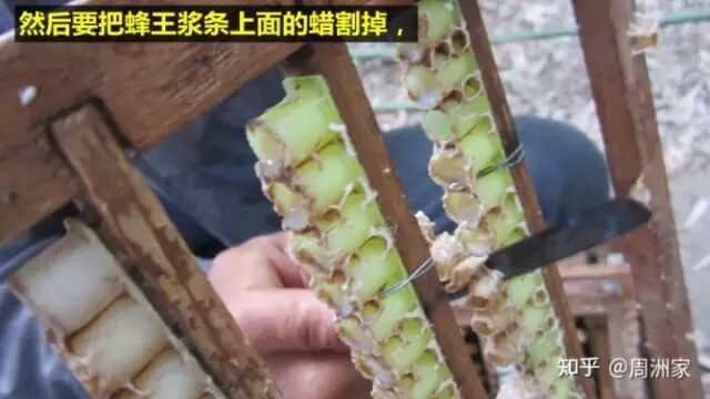 王浆的采收是蜂农模拟蜜蜂的习性制造王台,然后将一日龄的小幼虫移入,工蜂见到去分泌王浆喂食,当王台内的王浆达到一定数量时,大约经过72小时,再人工将幼虫移出,取出王浆收集起来即可以。