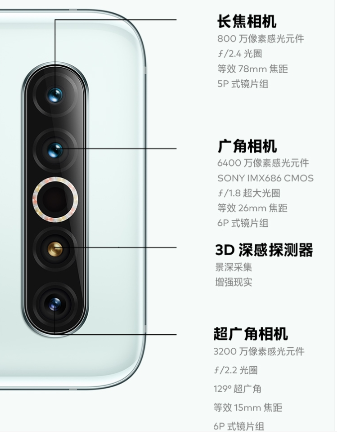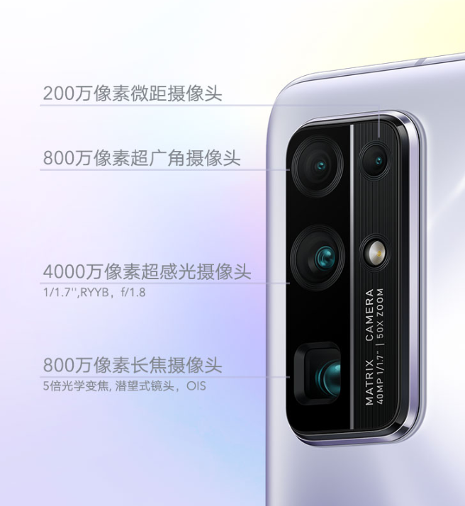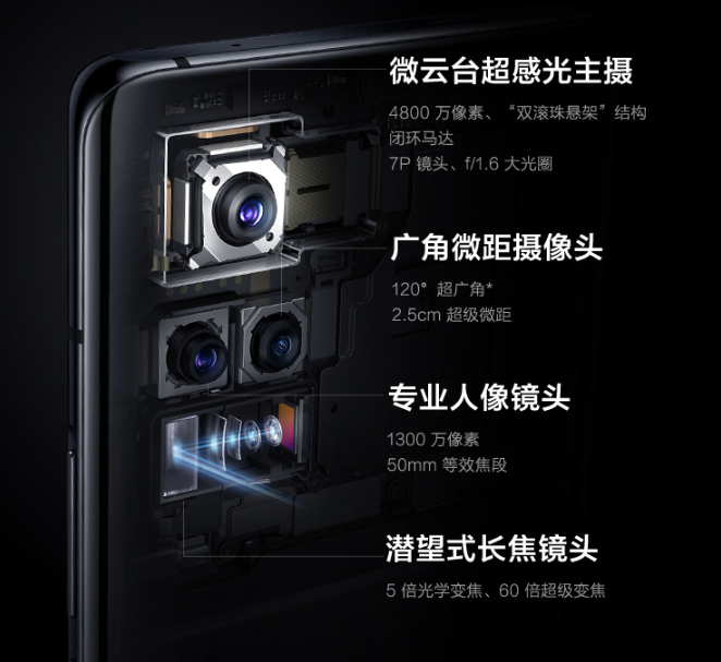 拍照方面,前置3200万像素美颜自拍。后置4800万像素微云台超感光主摄(IMX 598)+1300万像人像镜头+800万像潜望式长焦镜头+800万像120度超广角镜头,其中潜望式镜头支持了5倍光学变焦,60倍的数码变焦,微云台是装在主摄上的,随手一拍就很稳,防抖能力MAX。
