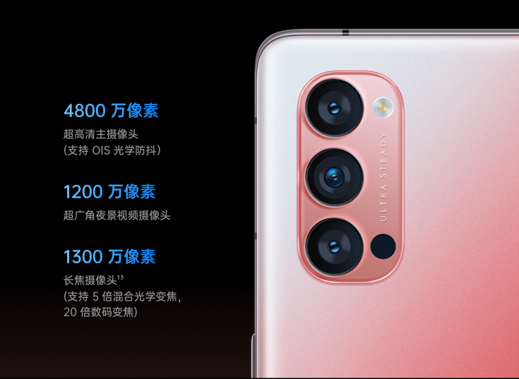 Reno4系列在前置3200W摄像头中一样加入了视频超级防抖算法,在720p@30fps时可与虚化、滤镜和美颜叠加使用,支持移动延时功能。后置4800万像素主摄(支持OIS)+1200万广角夜景镜头(IMX 708,120超广角)+1300万长焦镜头(可实现5倍混合光学变焦和20倍数码变焦)。