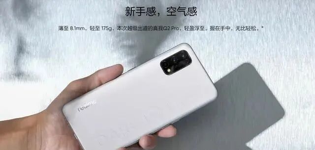 还是采用了一块6.43英寸的左上角挖孔屏,屏幕材质为oled。realme Q2 Pro主打的是轻薄体验,手机的整机尺寸仅为160.9×74.4×8.1mm,重量约为175克。这样的尺寸以及重量在众多5G手机中算是非常轻薄的,而且该机台内置了一块4300毫安的大容量电池,最高支持65瓦有线快充。