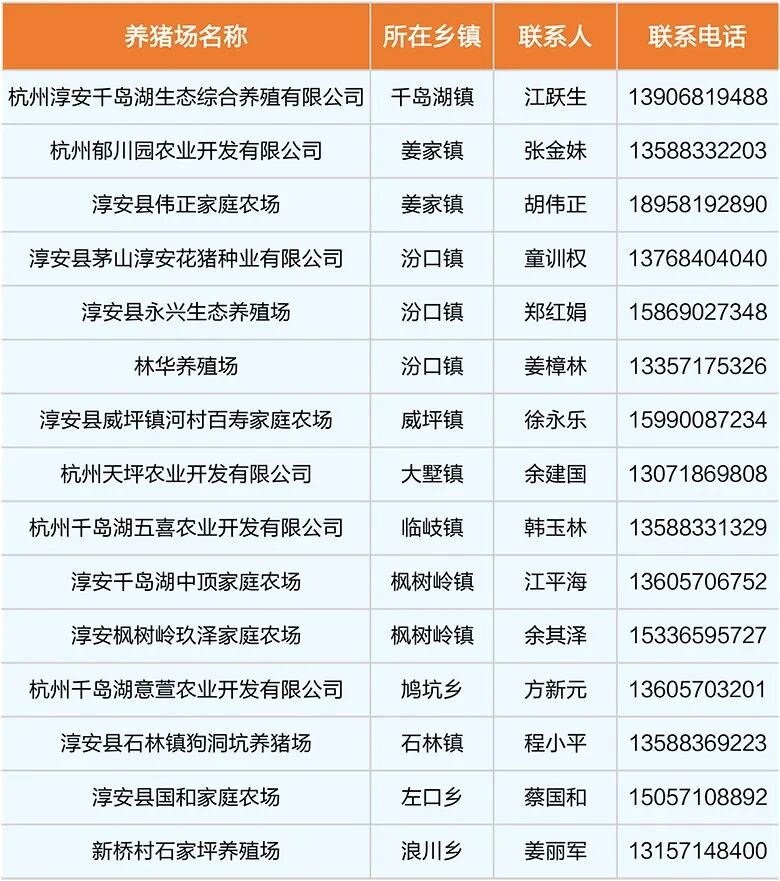 淳安县现有可供仔猪的规模养猪场(户)名单