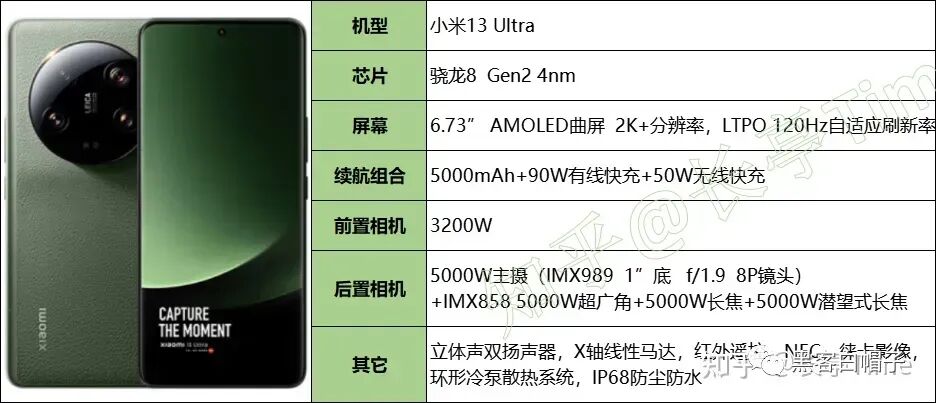 小米13 Ultra后置主摄搭载1英寸超大底图像传感器IMX989,另有三颗IMX858镜头分别负责超广角、长焦、超长焦镜头,是目前后置主摄最强悍的机型之一,如果追求极致拍照体验的话,可以侧重考虑。