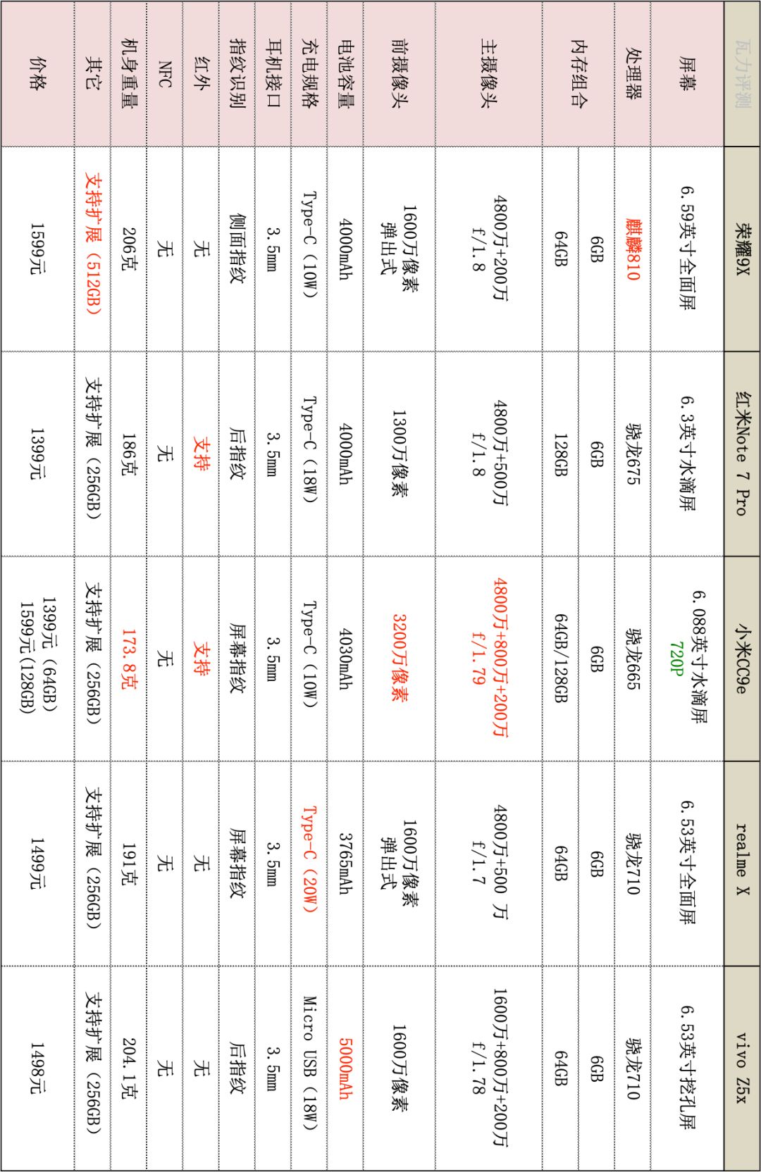这次可以入围我们推荐的产品包括:荣耀9X、红米Note 7Pro、realme X、vivo Z5X、小米CC9e。