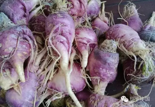 芜菁,又叫蔓菁,也属于十字花科,外形与玛咖接近,有青色品种和紫色瓶中。小型芜菁品种只有几十克,与玛咖相仿,但只能食用,完全不具备药用价值,通常用来制作腌菜。干果比鲜果容易造假。假玛咖干果主要采用的还是芜菁。芜菁的含水量大大高于玛咖,因此芜菁干果表面的褶皱明显多于玛咖干果,且褶皱较深,有时会开裂。但如果采用冻干的方法,这个区别就不是很明显了。制作精良的芜菁冻干果基本可以以假乱真。